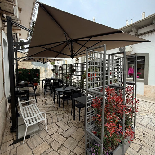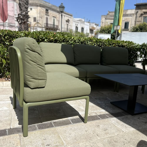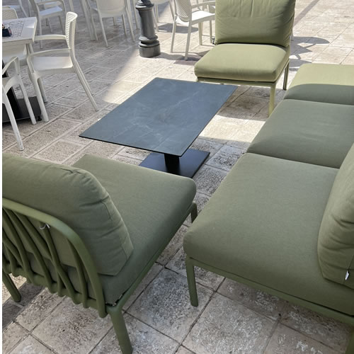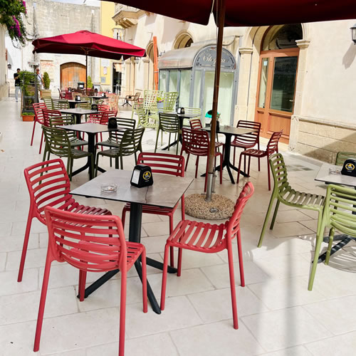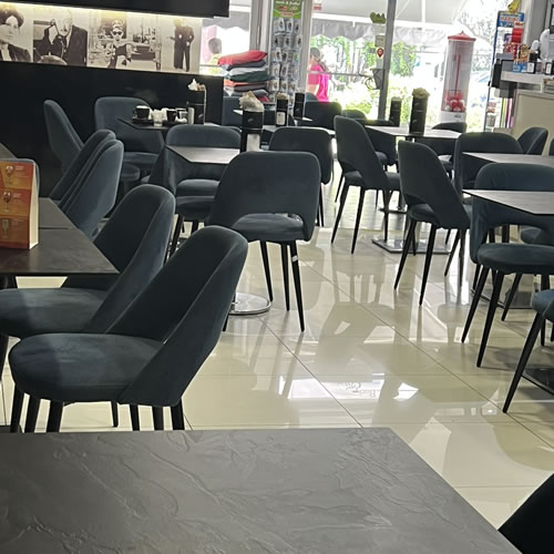 Per il bar Black and White abbiamo realizzato un ambiente accogliente e contemporaneo, fornendo le sedie imbottite Luna con rivestimento blu dalle sfumature calde, perfettamente abbinate ai piani in HPL effetto ardesia. Per l’area esterna, invece, sono stati scelti i divani modulabili Komodo nel raffinato colore Agave, una tonalità di tendenza che unisce comfort e stile per un’esperienza di relax elegante e armoniosa.