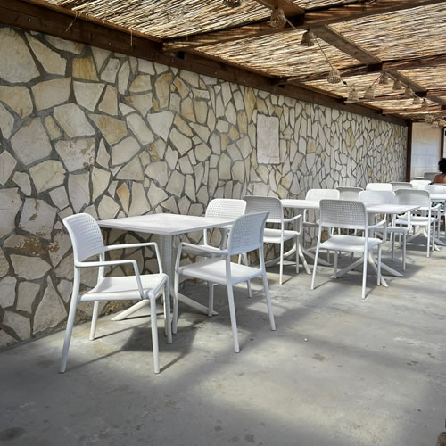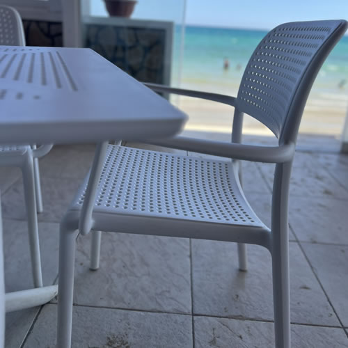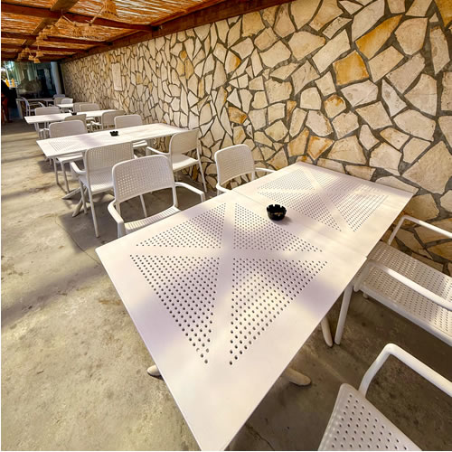 Per il Lido del Sole abbiamo fornito gli arredi firmati Nardi, scegliendo le sedie Bora e i tavoli Clip in bianco per esaltare il contrasto con il blu del mare. Arredi resistenti, pratici e confortevoli, perfetti per un utilizzo quotidiano all’aperto e pensati per durare nel tempo mantenendo eleganza e freschezza