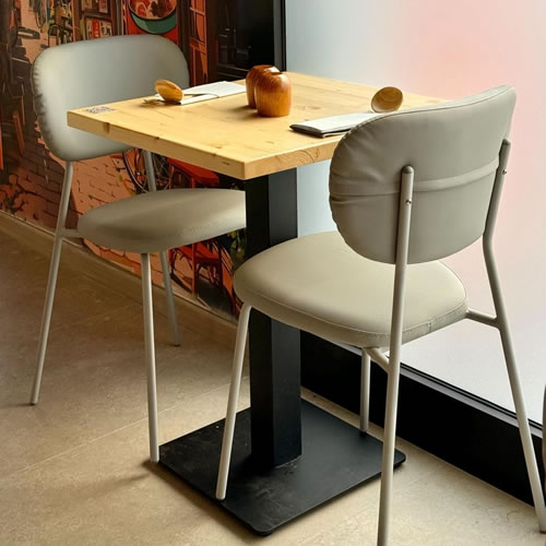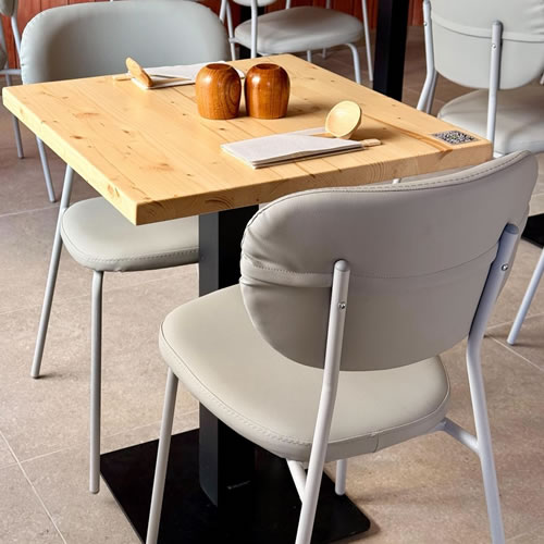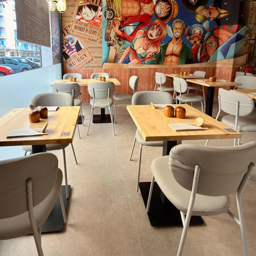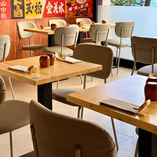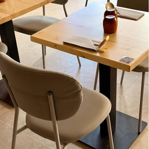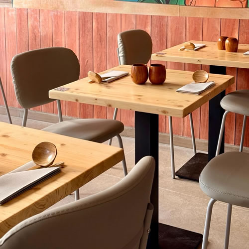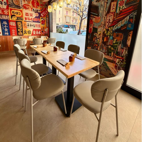 Per il locale Super Ramen abbiamo realizzato un arredo su misura unendo design, resistenza e personalizzazione. La sedia Vanessa in ecopelle resistente è stata abbinata alle basi Empoli quadrate e a un piano in abete massello, verniciato in colore naturale per armonizzarsi perfettamente con le pareti del locale.