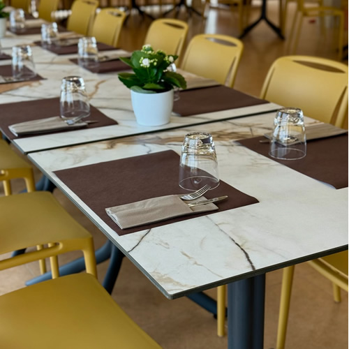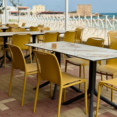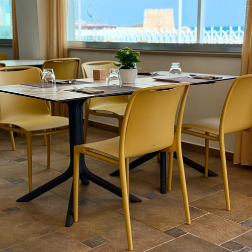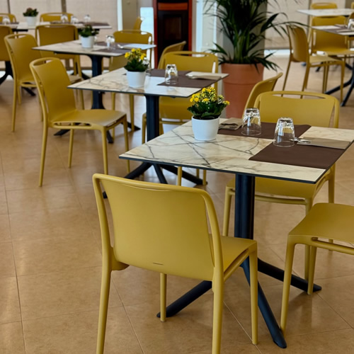 Abbiamo fornito le sedie Velair in polipropilene, nel moderno e ricercato colore giallo senape, una tonalità di tendenza che unisce stile e vivacità. Le sedute si distinguono per la loro resistenza agli agenti atmosferici e il comfort, rendendole ideali sia per ambienti interni che esterni. Le sedie sono state sapientemente abbinate a un piano HPL 5202 e a una base Clip in polipropilene rinforzato con fibra di vetro, per una soluzione d’arredo completa ed elegante, perfetta per spazi contract o residenziali.