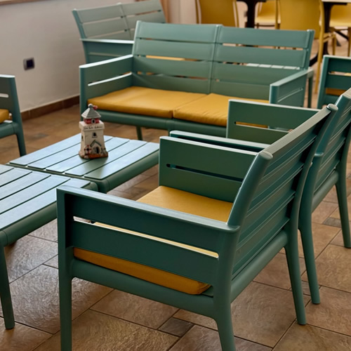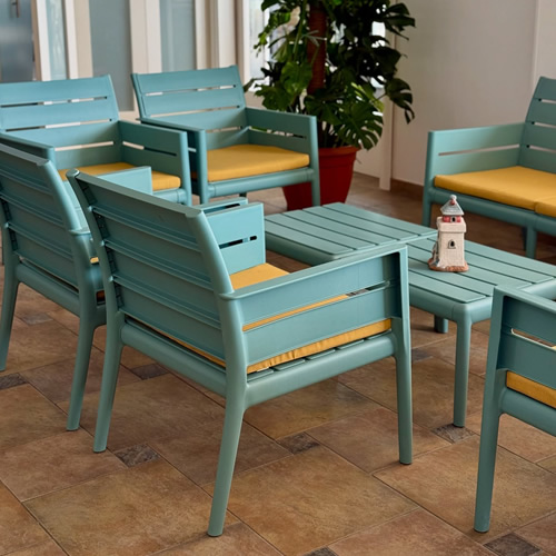 Abbiamo inoltre fornito il set Panka, caratterizzato da colori ispirati al mare, pensati per creare angoli di relax e benessere, ideali per lounge, terrazze o ambienti outdoor che richiedono stile e funzionalità.