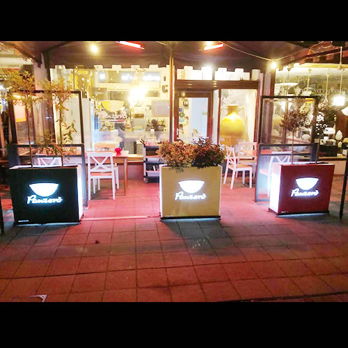 Per questo abbiamo pensato a 3 vasi luminosi, su ognuno di loro abbiamo applicato delle lastre di lamiera tagliata al laser con il logo e verniciate una con il verde e una con il rosso, lasciando il vaso centrale bianco. Questo ha formato la bandiera Italiana e la sera, illuminando le fioriere, l’effetto è ancora più scenografico.