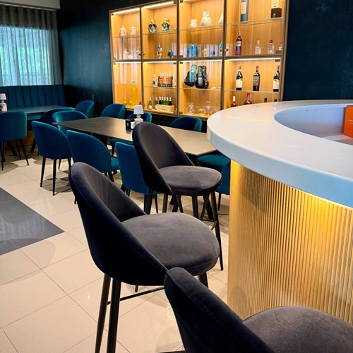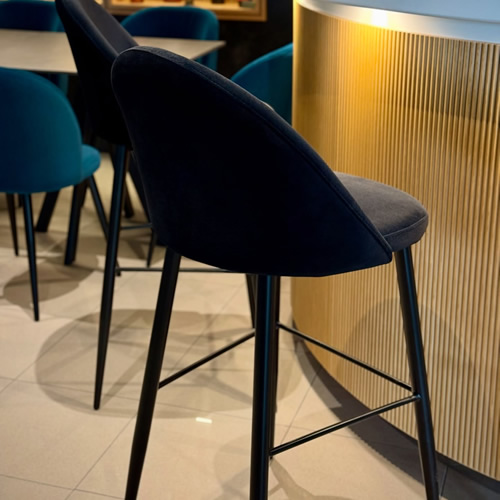 Per completare l’arredo, è stato abbinato lo sgabello Lola, rivestito in velluto di un colore a contrasto, mantenendo però le stesse caratteristiche tecniche e funzionali, per un risultato armonioso e coordinato, ideale per un locale accogliente e di tendenza.