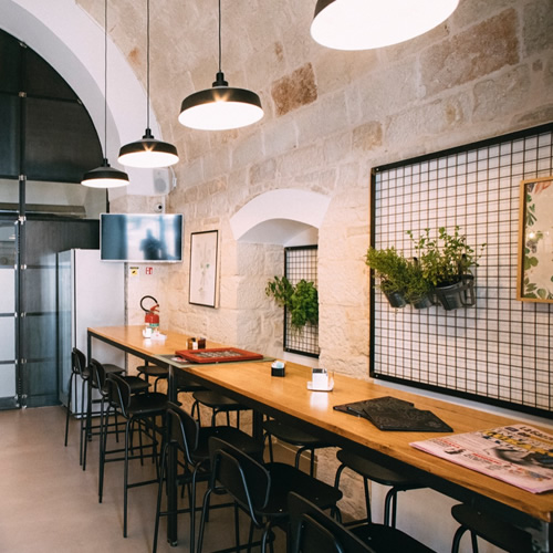 Per Erbavoglio Bistrot, abbiamo realizzato tavoli, sedie e sgabelli in lamiera, un materiale robusto e versatile che conferisce al locale un look industriale distintivo. Questo stile, reinterpretato in chiave moderna, si adatta perfettamente a diverse tipologie di pizzeria a Molfetta, dal locale più tradizionale al ristorante di tendenza.